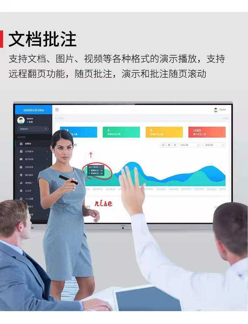 Supports presentation and playback of documents, pictures, videos and other formats. Support remote page turning function, page annotations, presentations and annotations scroll with the page.