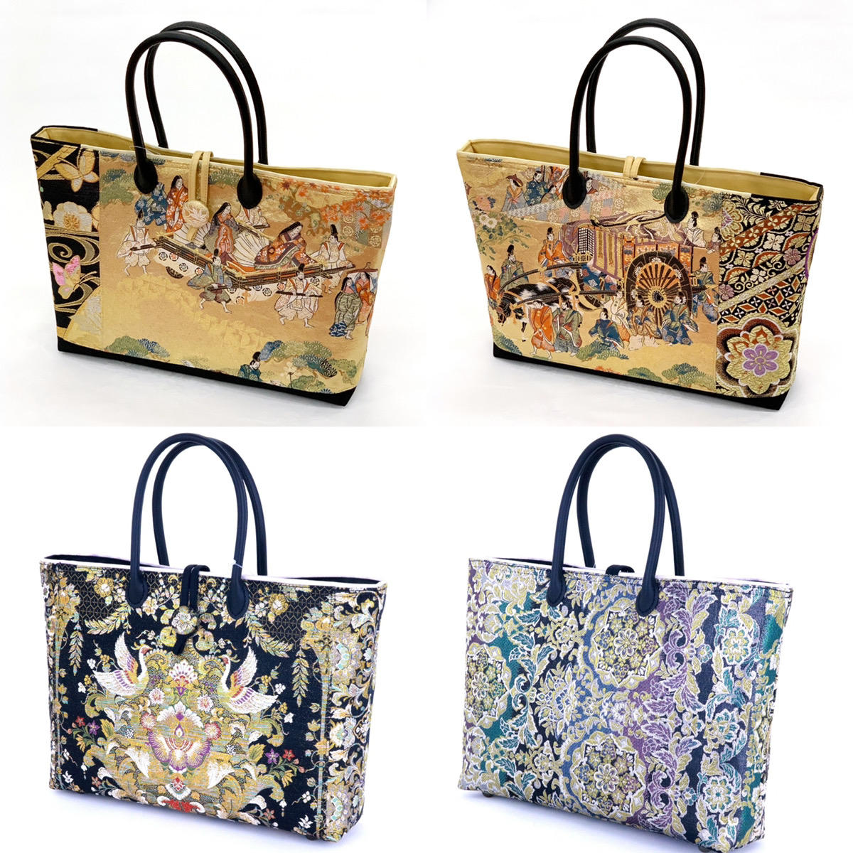 ONLY HERE!!! Shitateya Jingoro original bag collection, made from kimono fabrics and silk obi fabrics. Various types of bags are available for different occasions. All bags can be zippered. 【Highest class “JIN-bag”】 •Luxurious bag made of the finest pure silk fabric or phantom fabric made of “Nishijin-Obi” fabric or Shitateya Jingoro's original fabric (Sakiko). •The inside of the bag is also made of kimono fabric •It has pockets for small items. •It has bottom studs to prevent staining •Original charm included •Fits A4 size files and plastic bottles •Lightweight and easy to hold •The handle is made of fine leather.