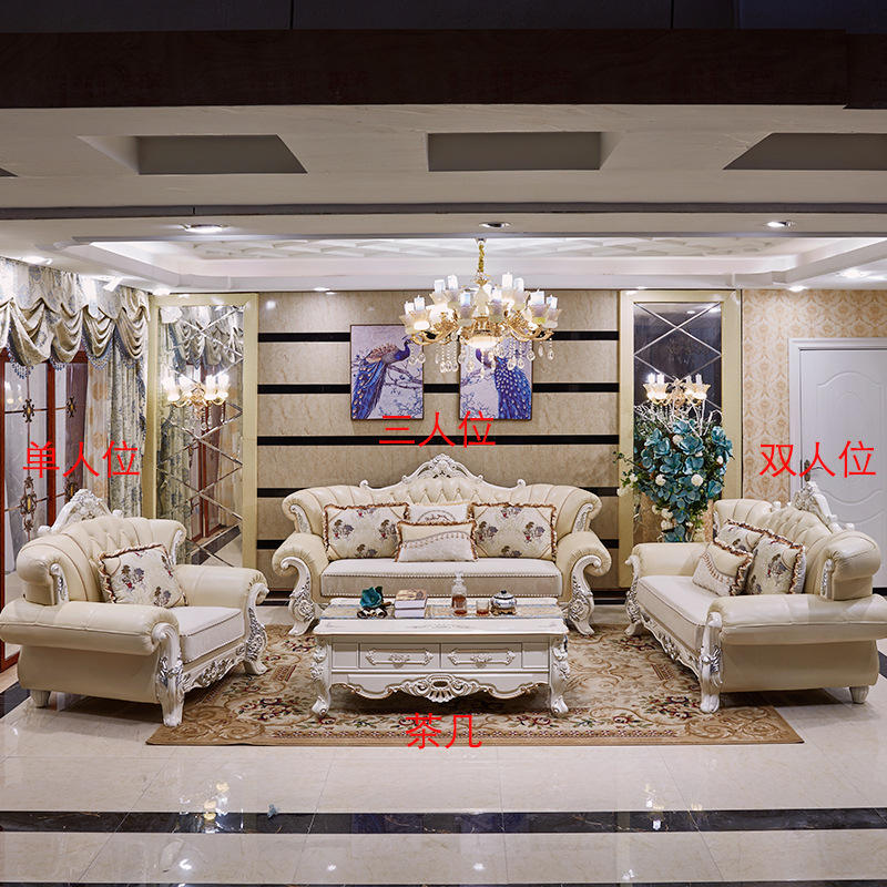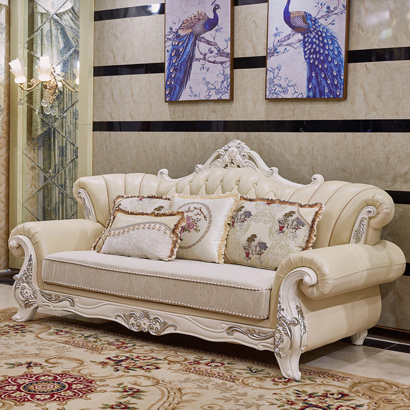 3 2 1 Seater Leather Sofa Set Living Room Furniture Antique Solid wooden Carved Frame 7 seater sofa