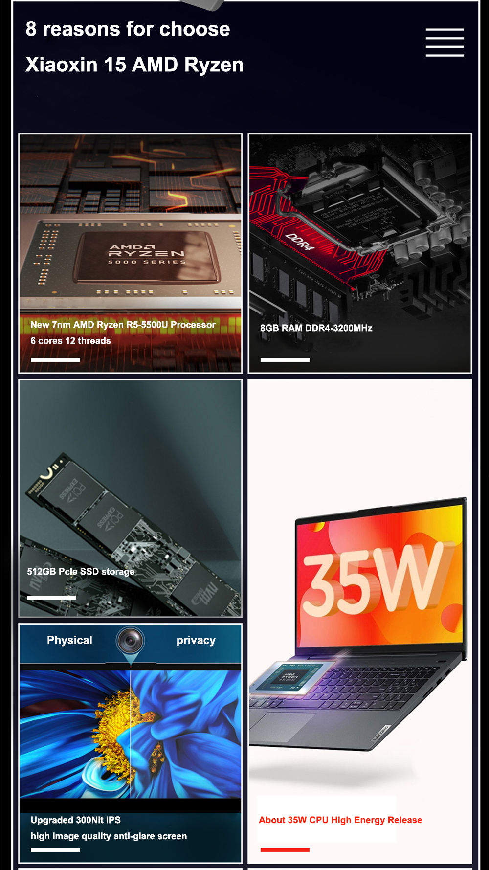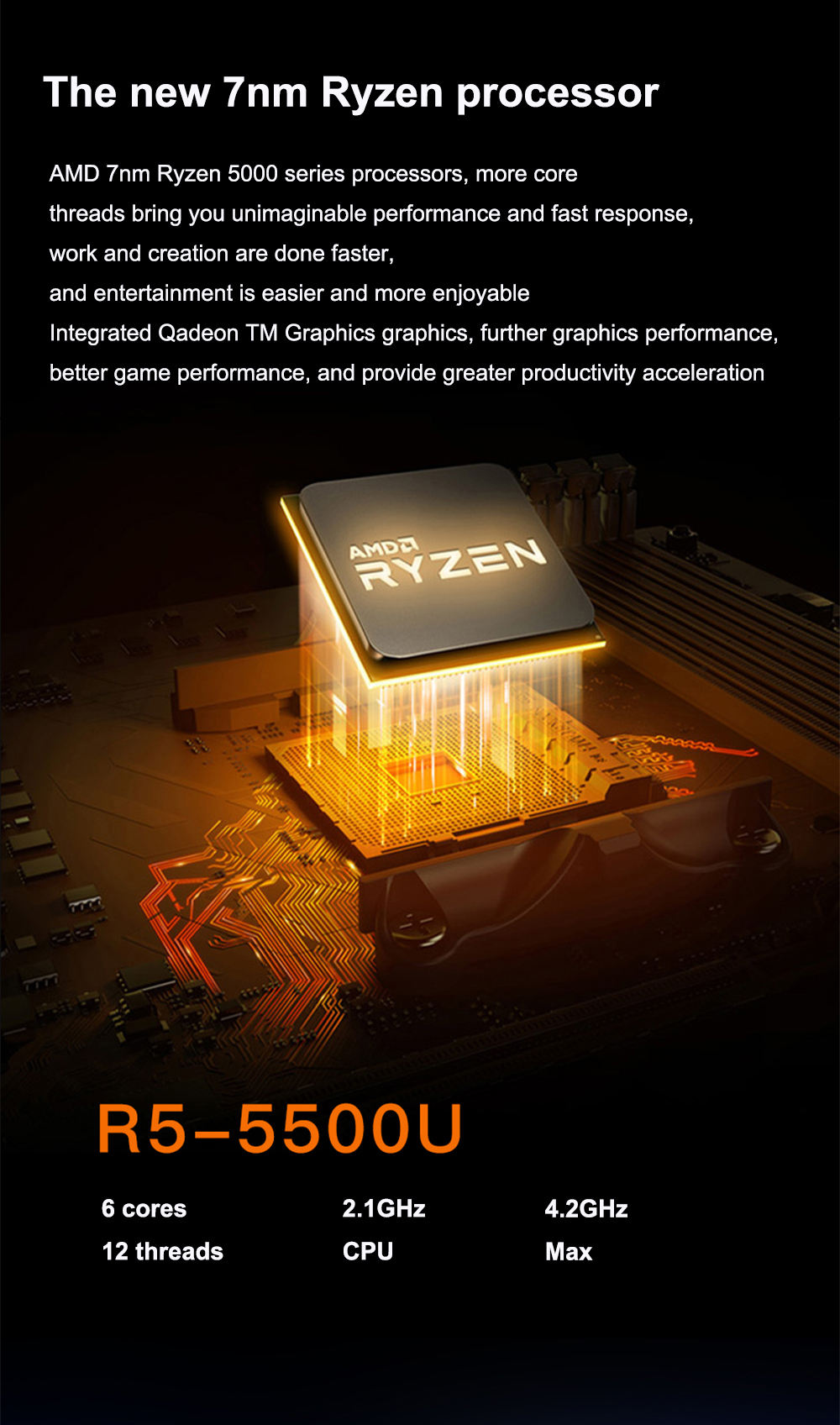 CPU model: R7 5500U CPU frequency: 2.1GHz The highest core frequency: 4.2GHz Level three cache: 8MB Number of cores: 8 cores |