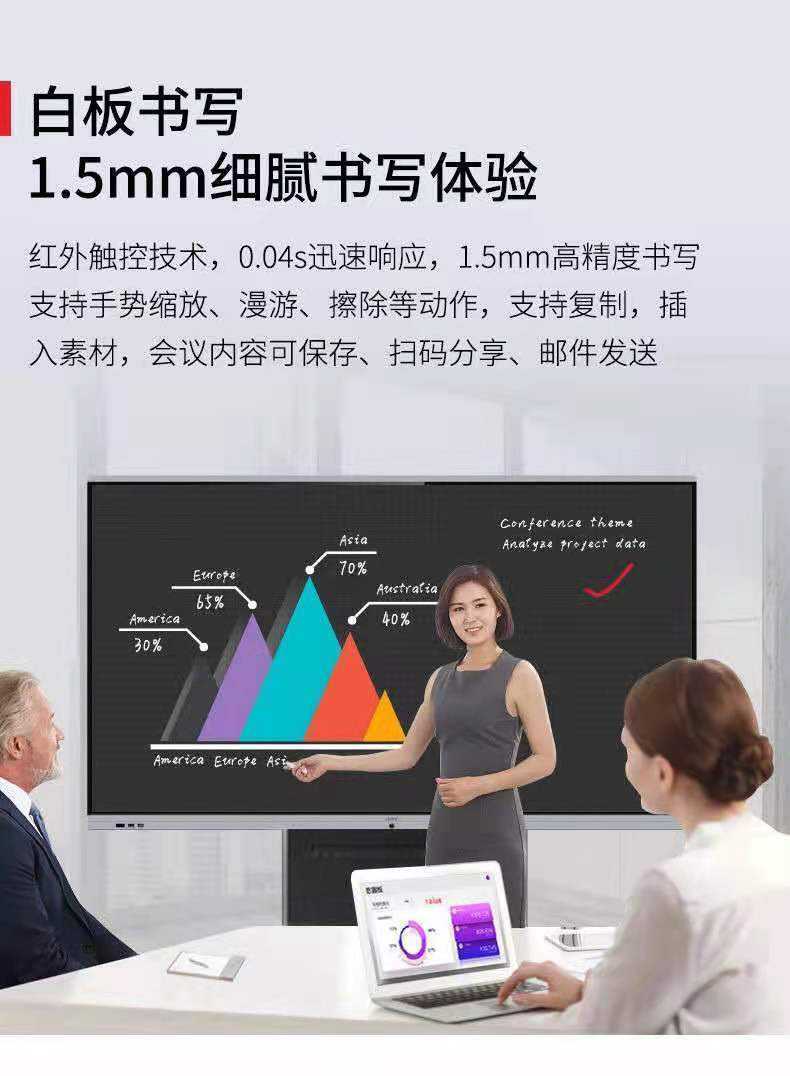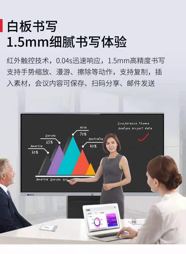 Infrared touch technology, 0.04s quick response, 1.5 mm high-precision writing.Support gesture zooming, roaming, erasing and other actions. Support copy, insert Enter the material, the content of the meeting can be saved, shared by scanning the code, and sent by email.